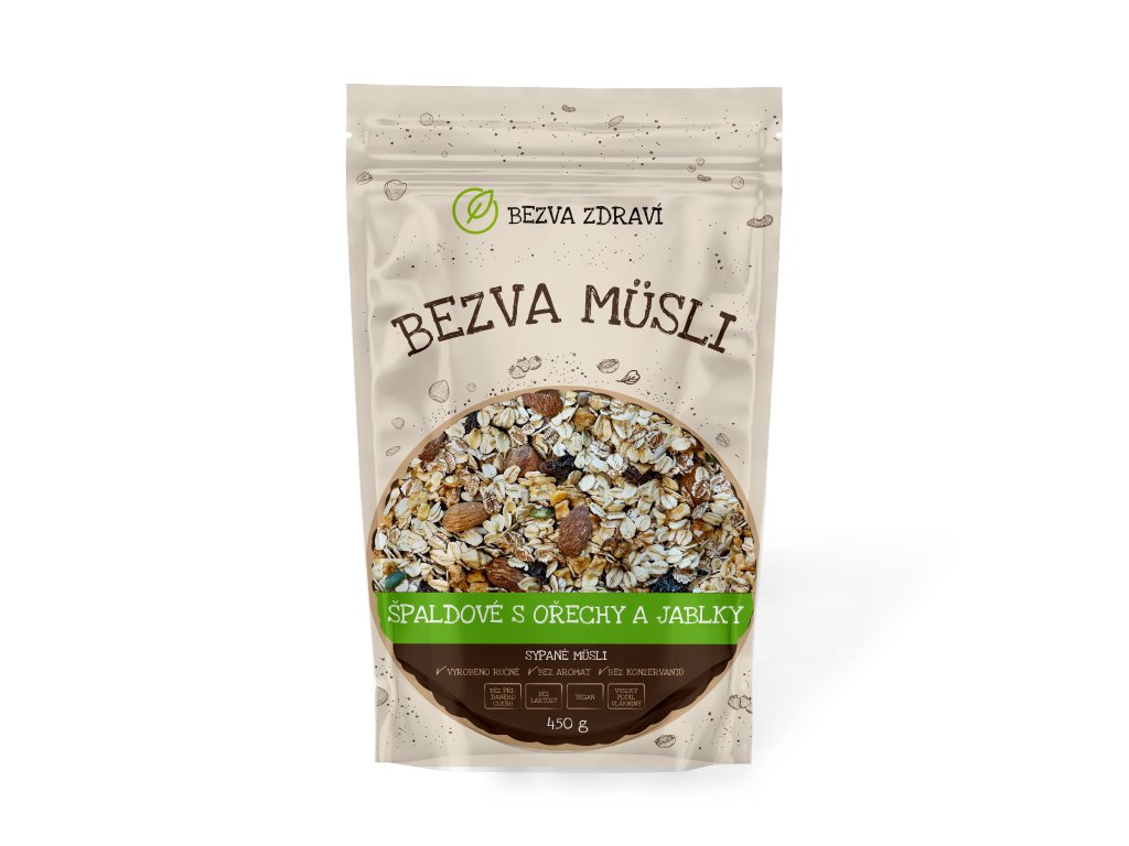 Směs ovesných vloček instantních a špaldových vloček se sušenými jablky, rozinkami, lískovými jadérky, mandlemi, hnědým lnem a s loupanými semínky slunečnice a dýně.