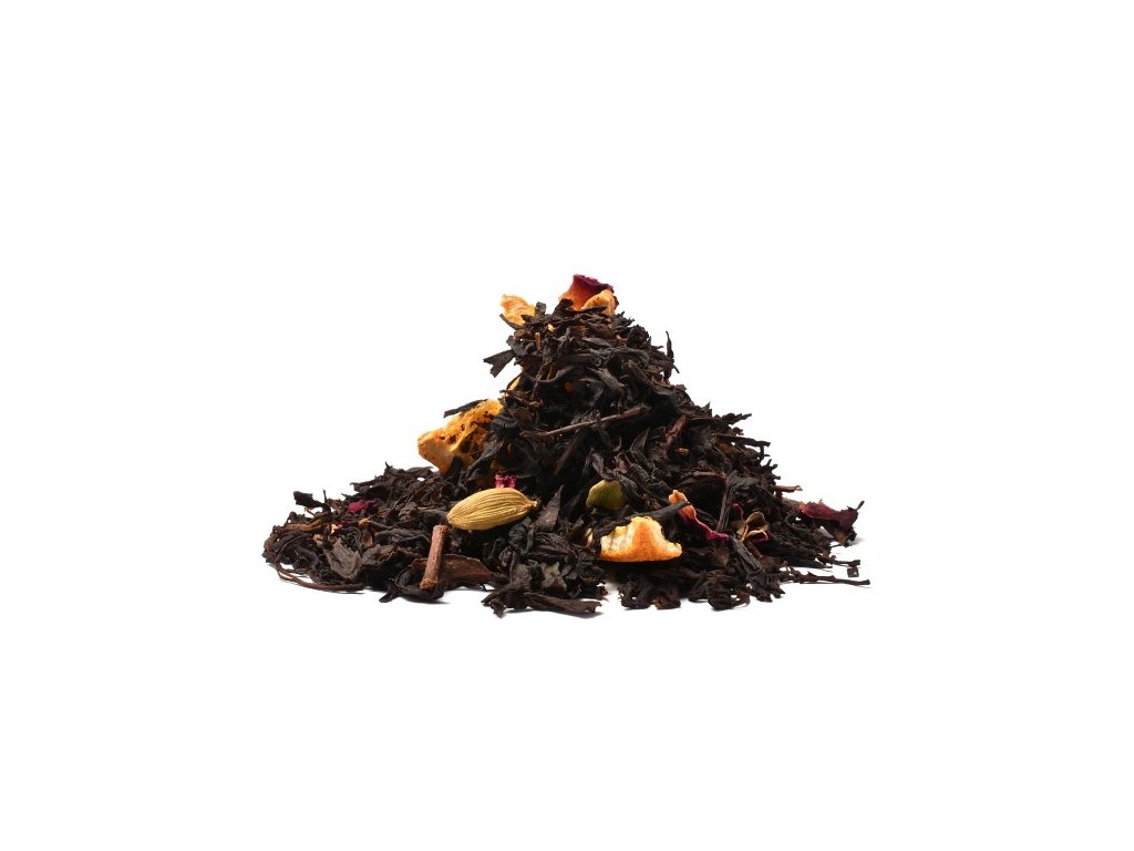 Černý čaj, pomerančová kůra, mandle, růže květ, hřebíček, kardamom, aroma.