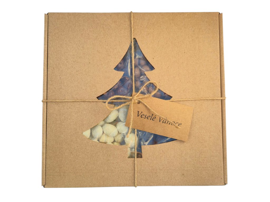 Dárkový balíček nejen pro vaše blízké obsahuje mandle a kešu v různých druzích čokolády: