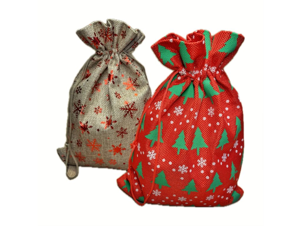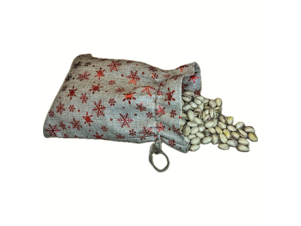 Jutový pytlík s vánočním motivem obsahuje 800g pistáciových pražených solených neloupaných ořechů.