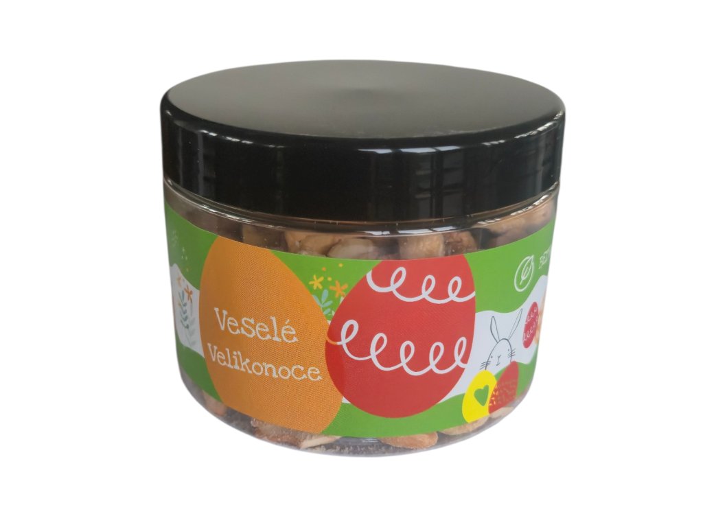 Praktická dóza s velikonočním motivem obsahuje 240g pražených, solených kešu ořechů.
