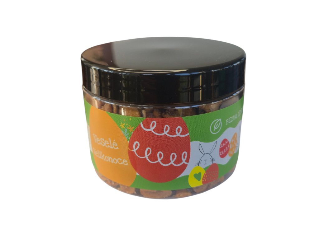Praktická dóza s velikonočním motivem obsahuje 210g mandlí půlek v medu a soli.