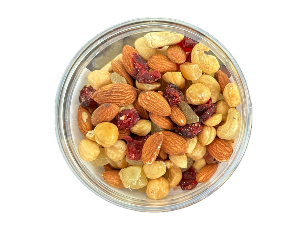 Složení: směs pražených ořechů na sucho v různém poměru 60% (mandle natural, kešu, lísková jádra loupaná), směs sušeného ovoce v různém poměru 40% [ ananas (ananas, cukr, regulátor kyselosti: kys.citronová, konzervant: oxid siřičitý), brusinky (brusinky, cukr, slunečnicový olej), papaja (papaja, cukr. konzervant: oxid siřičitý)]