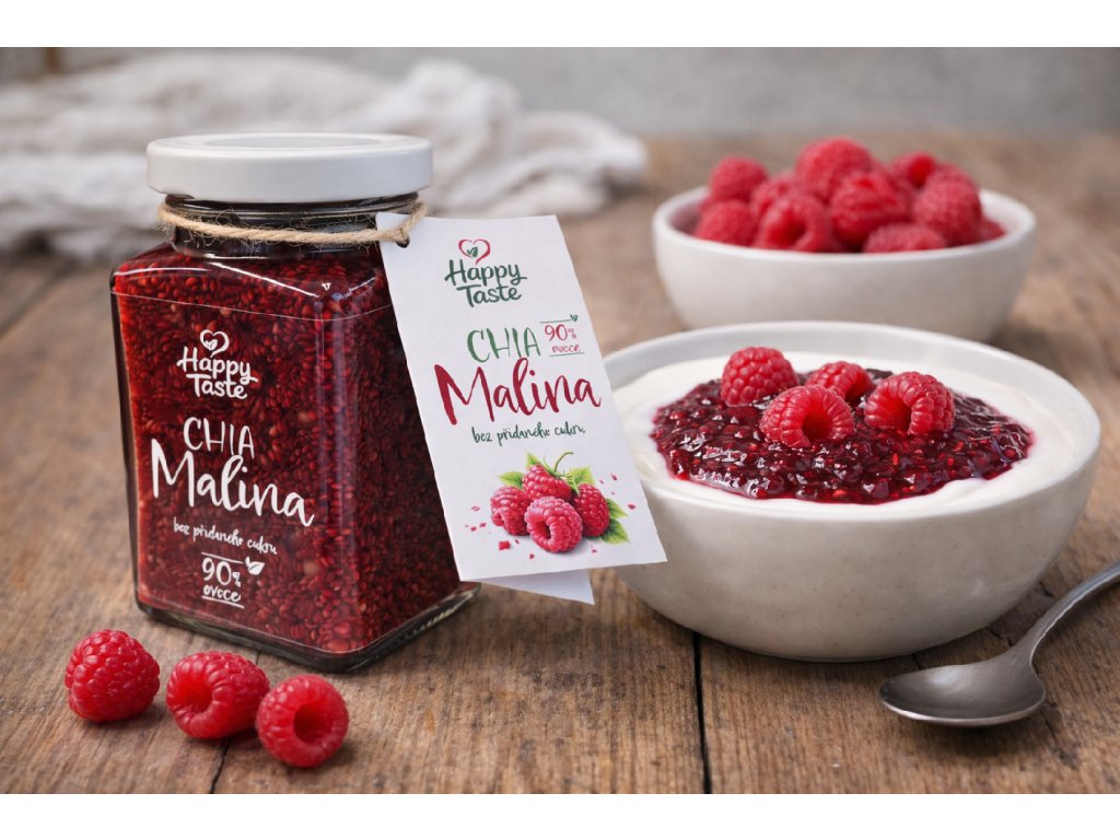 Složení: Maliny 50%, zahuštěná šťáva z bílých hroznů, semena chia 10%.