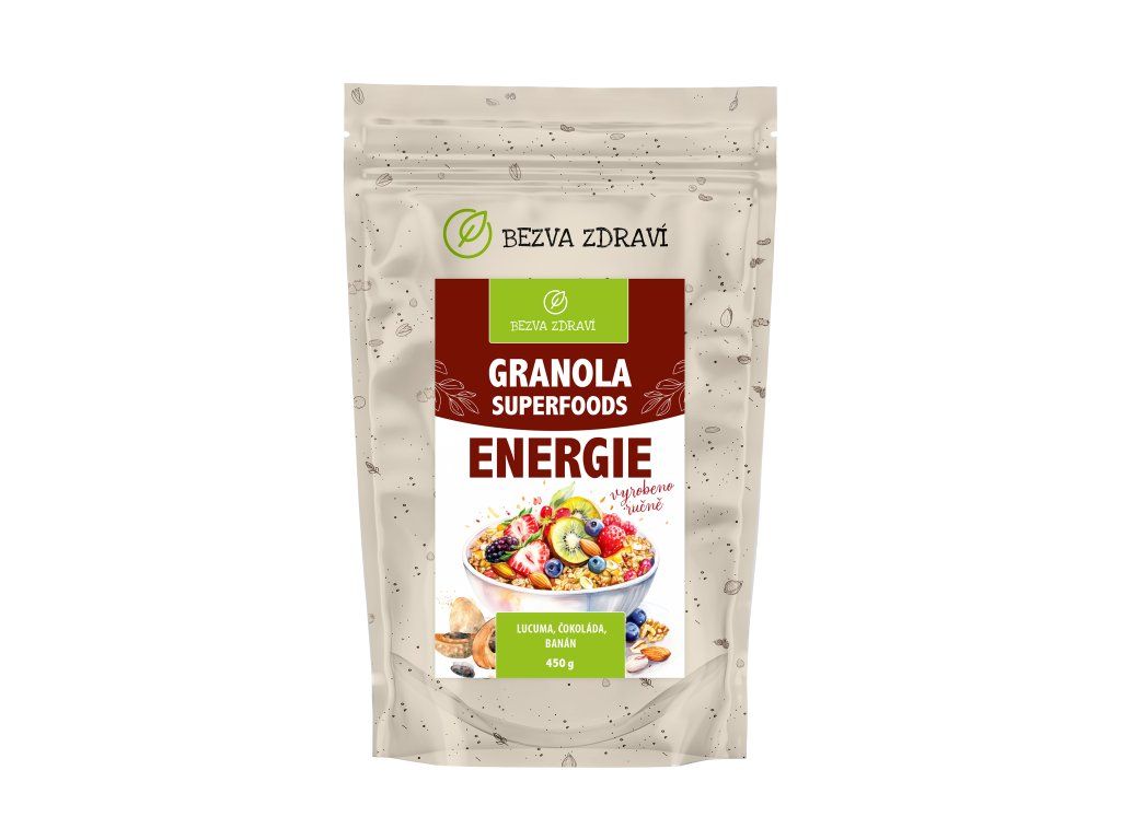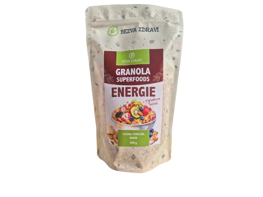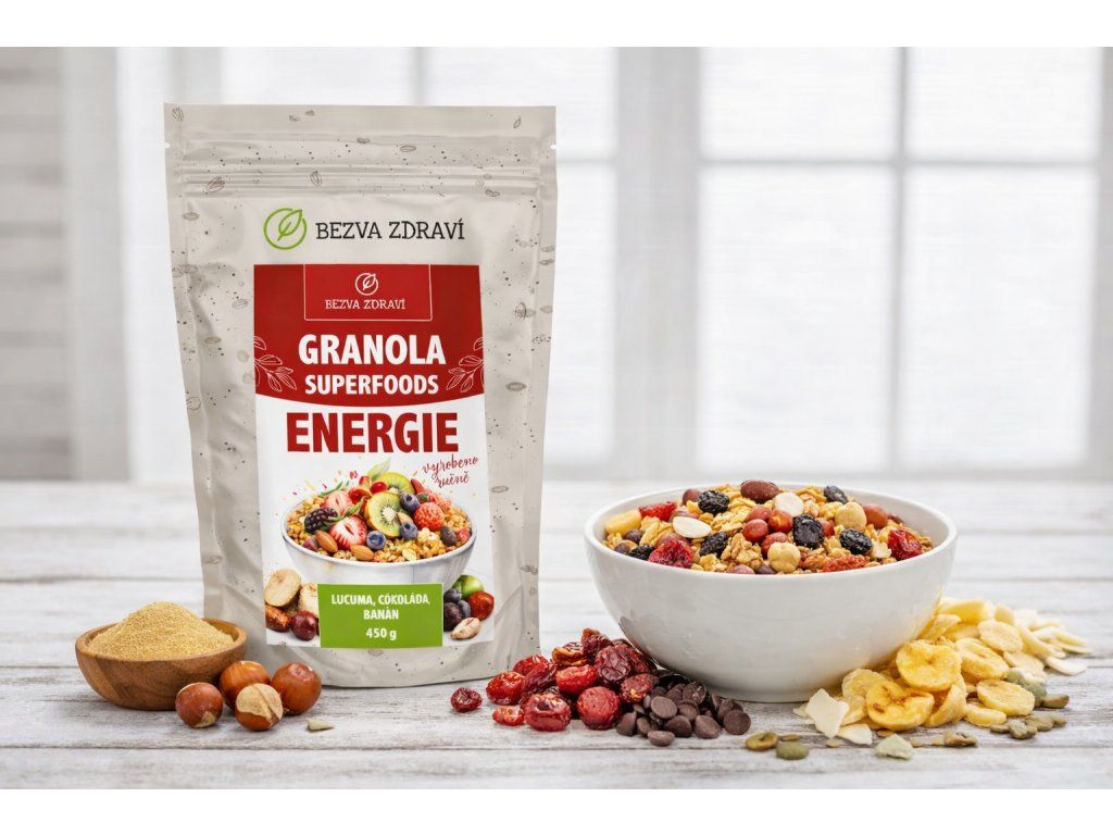 Složení: granola - pečené vločky 56% (ovesné vločky, rýžový sirup, za studena lisovaný slunečnicový olej),sušené brusinky-klikva (brusinky, cukr, slunečnicový olej), lískové ořechy pražené na sucho, čokoládové pecičky 8% (cukr, kakaová hmota, kakaové máslo, emulgátor: sojový lecitin; aroma: vanilin), bananové kousky nesířené 8%, kokosové plátky, lucuma prášek 2%.