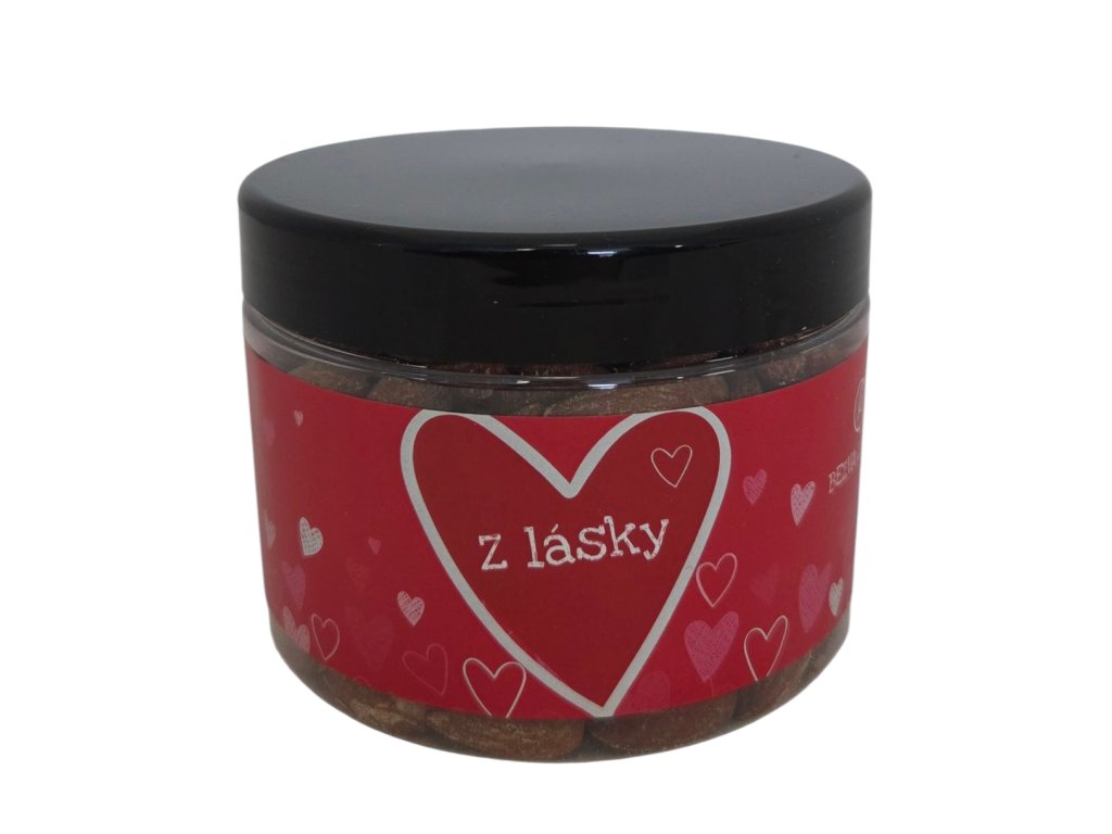 Praktická dóza s motivem srdce obsahuje mandle s uzenou příchutí.