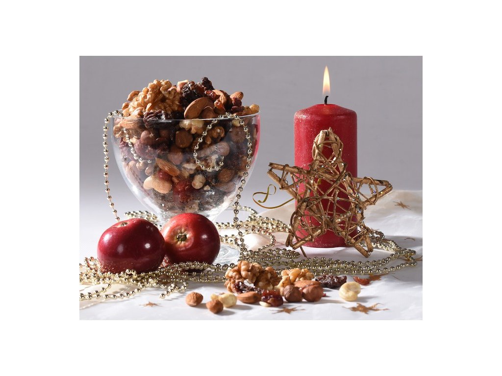 Složení: směs ořechů v různém poměru 64% (vlašské ořechy, lískové ořechy, mandle loupané, kešu pražené solené), směs ovoce v různém poměru 36% [rozinky jumbo (rozinky, slunečnicový olej), višně natural,jablíčka sušená].