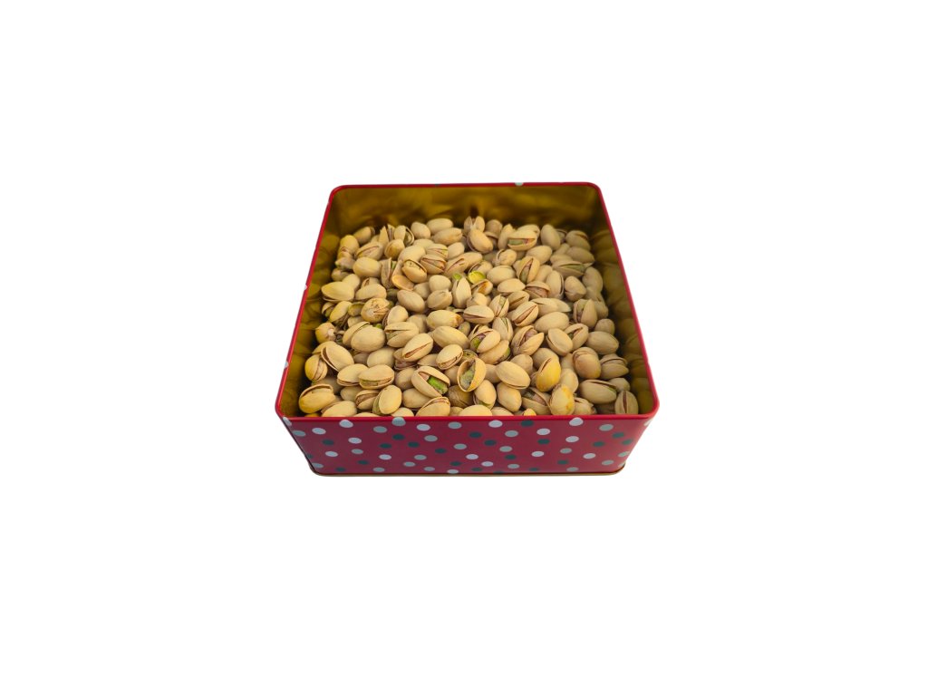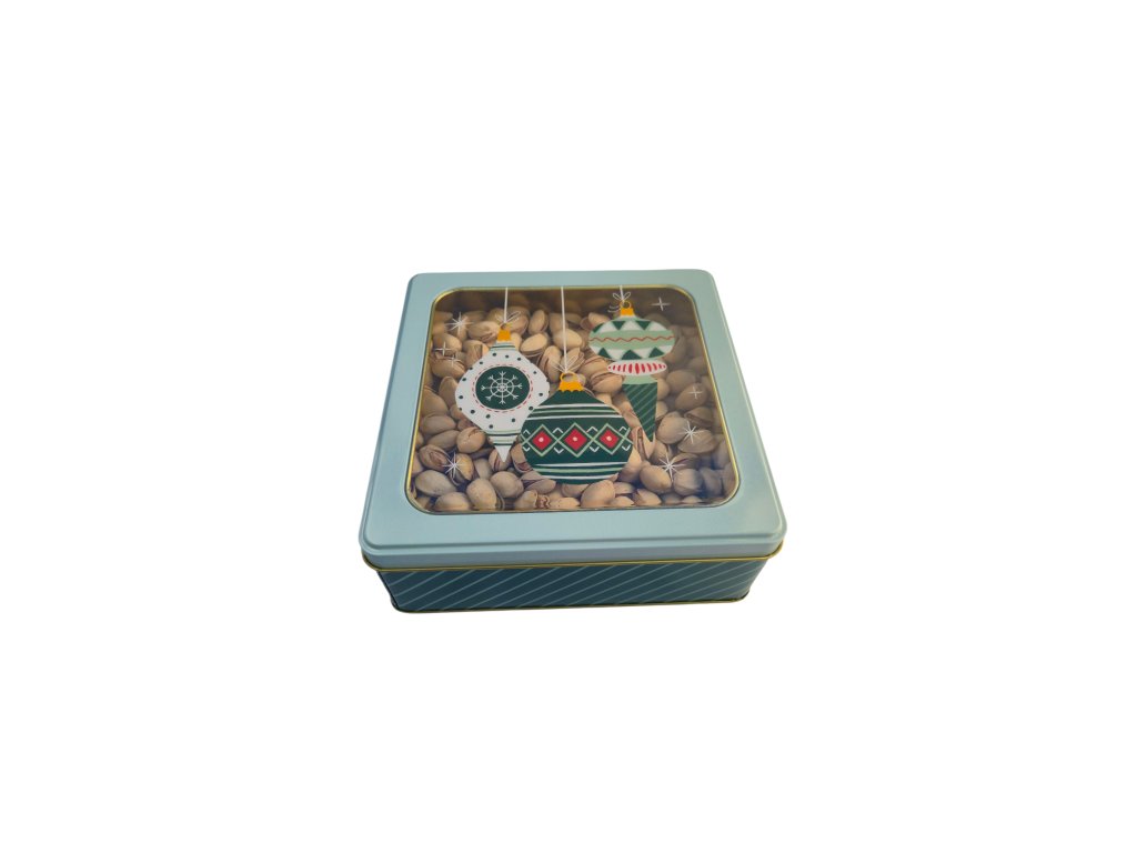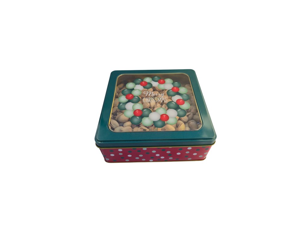 Střední čtvercová plechová dóza s vánočním motivem, rozměry 18cm x 18cm, výška 7cm.