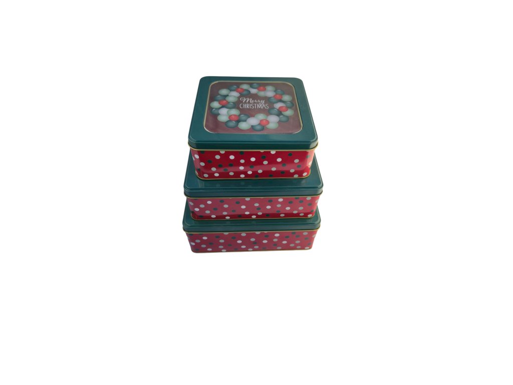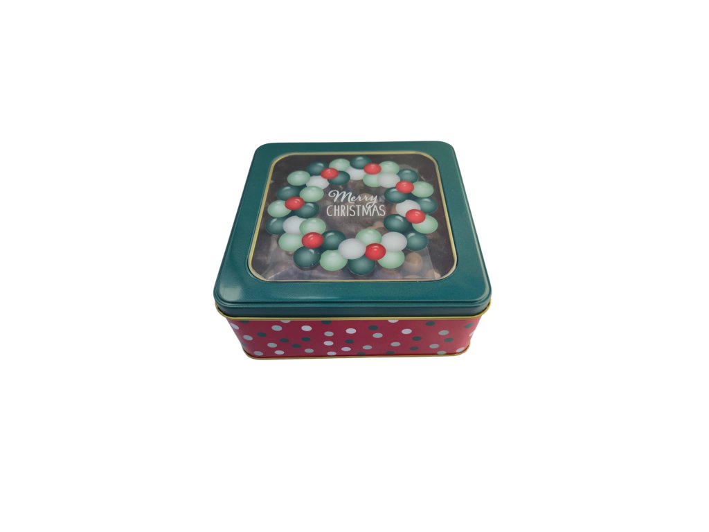 Malá čtvercová plechová dóza s vánočním motivem, rozměry: 15cm x 15cm, výška 6cm.