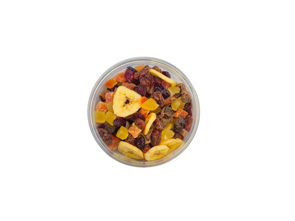 Složení: směs sušeného ovoce v různém poměru (ananas, rozinky Jumbo, datle sekané, papaja, brusinky, banán), cukr, slunečnicový olej, rýžová mouka, konzervant: oxid siřičitý.