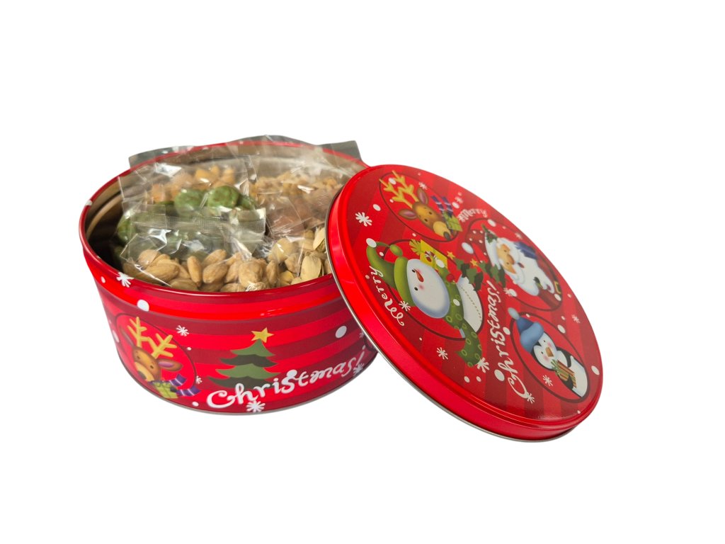 Velká plechová dóza s vánočním motivem, průměr 19,5, výška 9 cm.