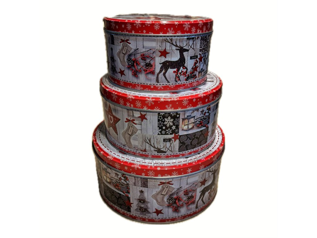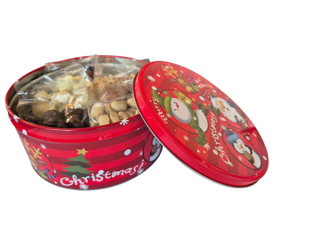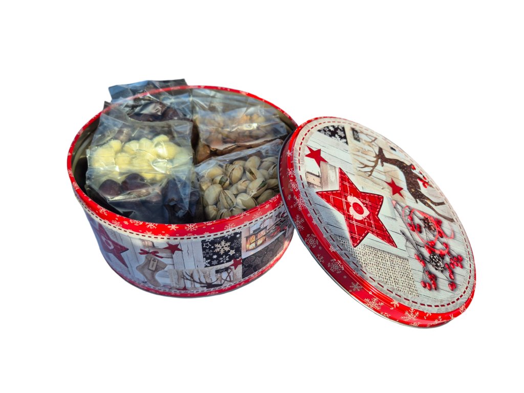 Vánoční plechová dóza sladkých a slaných ořechů kulatá